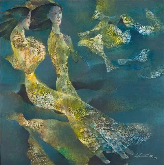 Thế giới nghệ thuật của ông là sự kết hợp độc đáo giữa các hình tượng quen thuộc: thiếu nữ – hoa sen – mảnh trăng. Những hình ảnh này không đơn thuần là miêu tả hiện thực, mà đã được chọn lọc và biến thành những biểu tượng mang vẻ đẹp tinh khiết, hồn nhiên trong một không gian vừa thực vừa siêu thực.